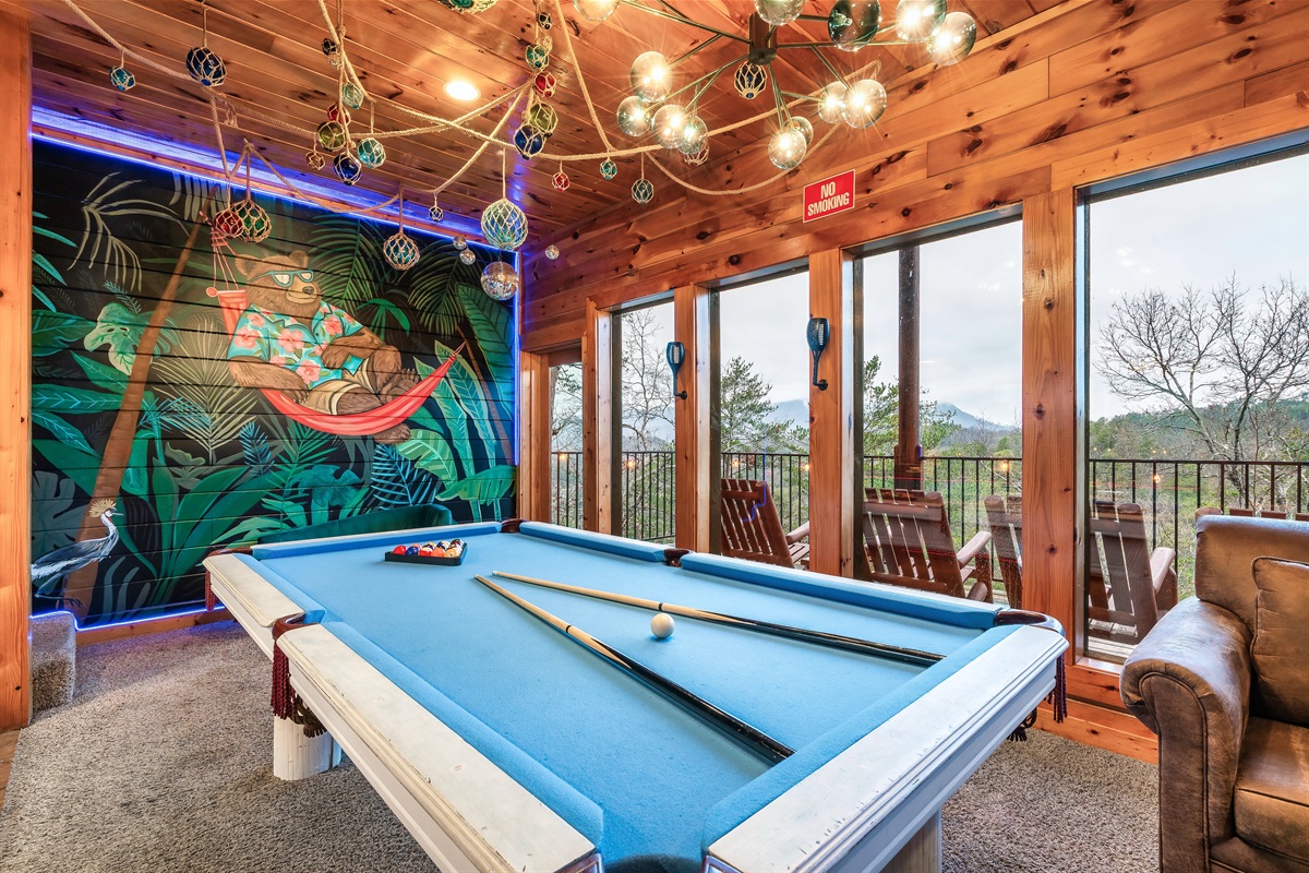 Guests can enjoy a 100-inch cinema with surround sound, a tropical disco-themed lounge with pool table, foosball, and arcade games, plus an air-hockey loft. The decks, hot tub, and outdoor seating also offer relaxation with mountain views.