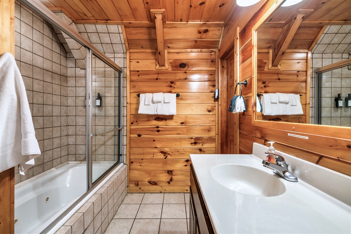 With six full bathrooms – five with jetted tubs and one with a jetted shower – there’s no waiting in line here. Every bathroom has A+ water pressure, and is stocked with shampoo, body wash, and a hair dryer, plus plenty of towels for your group. You’ll also find a washer and dryer, perfect for mid-trip refreshes or post-hike cleanups.