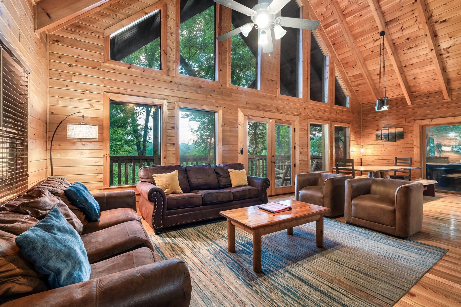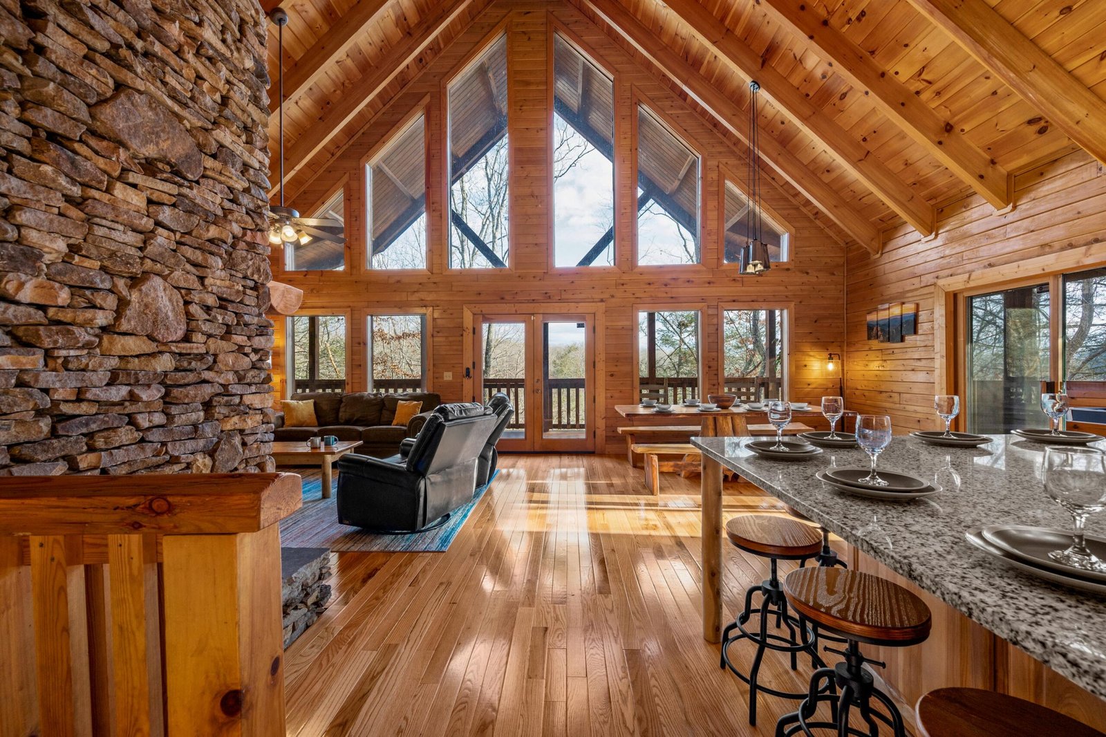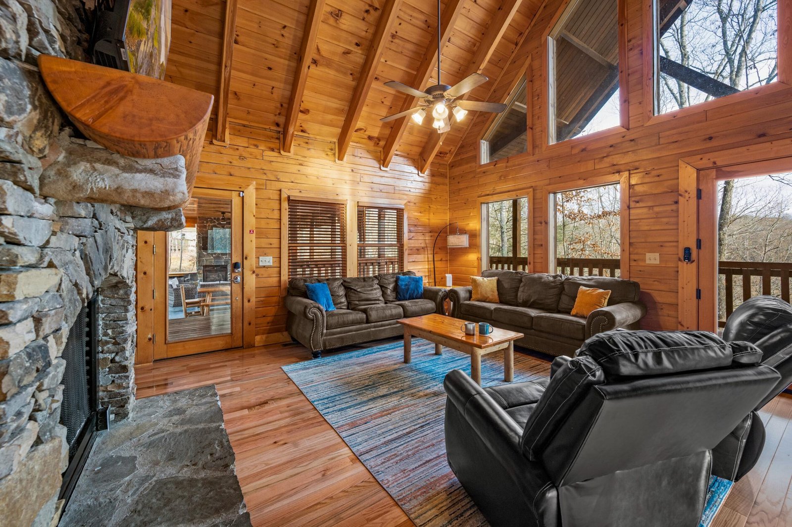 Living Room: Enter the huge A-frame living room with soaring ceilings and natural light. Cozy up by the massive stone fireplace or gather on the comfortable sofas and chairs. The living room is perfect for relaxing after a long day of exploring the nearby attractions. Play games, watch TV, cook a meal all with space for everyone.