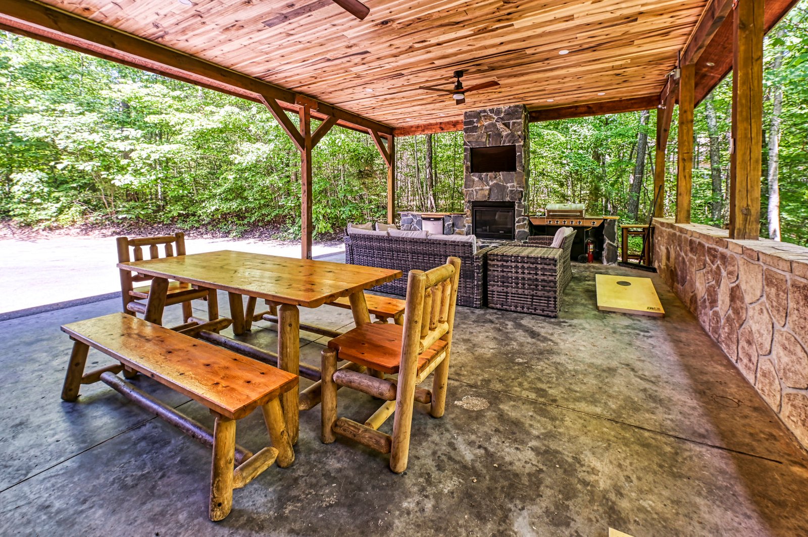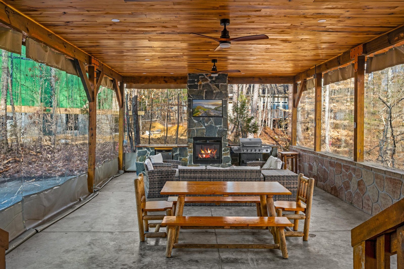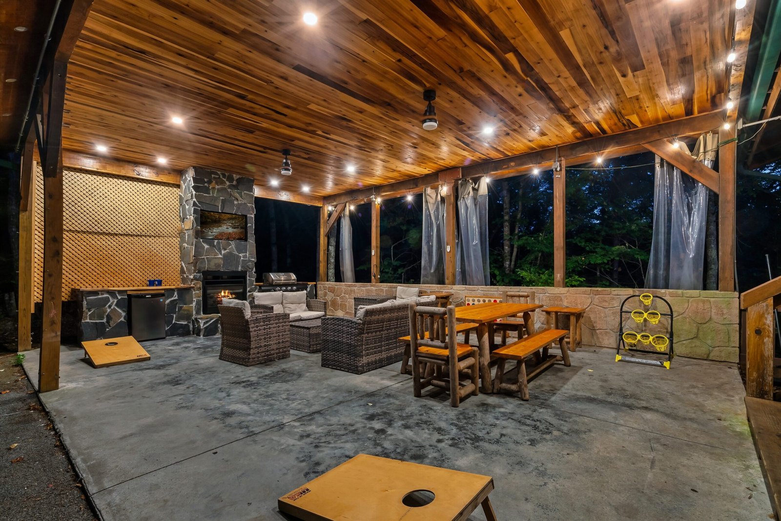 Outdoor Living: Step into our covered outdoor living room with a gas grill, fridge, comfy couches, TV, and a stone fireplace. Enjoy meals al fresco, play corn hole, giant Jenga, or Connect 4 while watching the game. The breeze and overhead fans keep it cool all summer. Clear curtains and a fireplace keep the chill out in the cooler months. We provide free propane for the grill, so you’ll never have to worry about refilling.