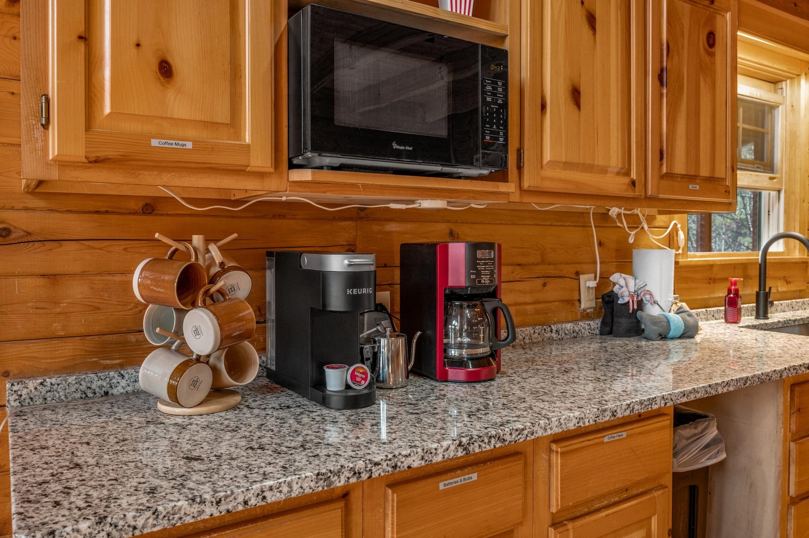 Kitchen: The chef’s kitchen is fully equipped with granite countertops, a large island with counter seating, and two pantries. We’ve provided all the dishes, glassware, silverware you’ll need, including kids’ plates and utensils. And we’re fully stocked with cookware including a crockpot, baking items, you name it,.  Coffee lovers will love our coffee bar with a Kurig, coffee pot, grinder, and pour over.