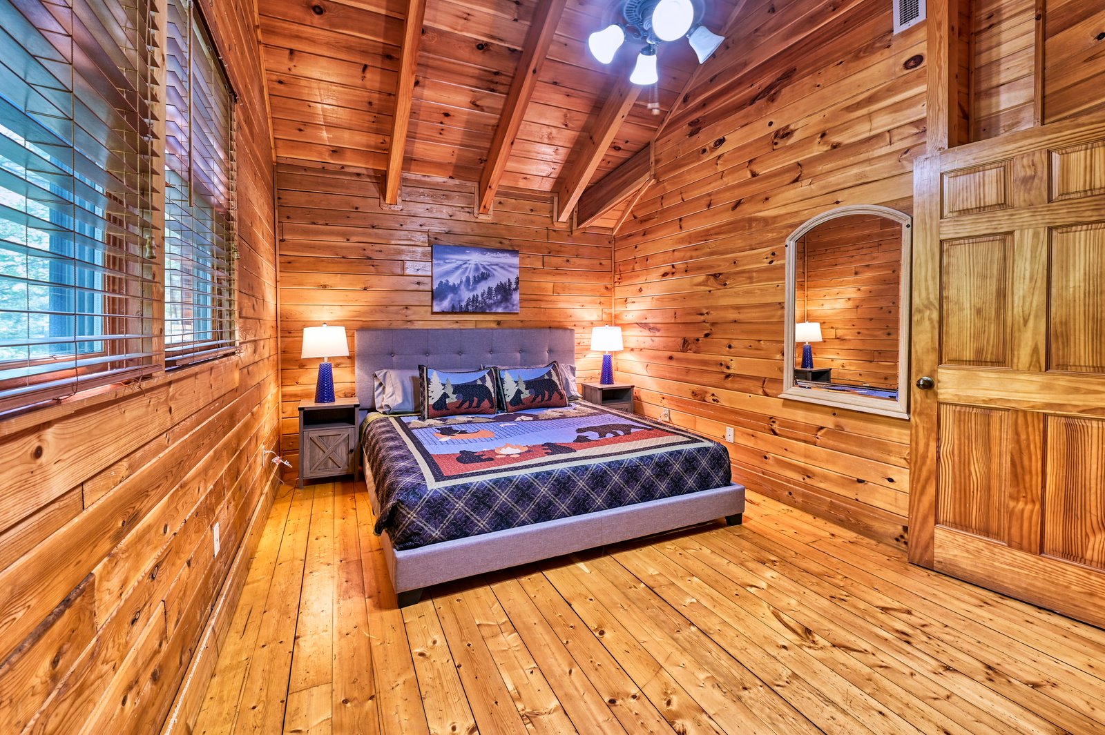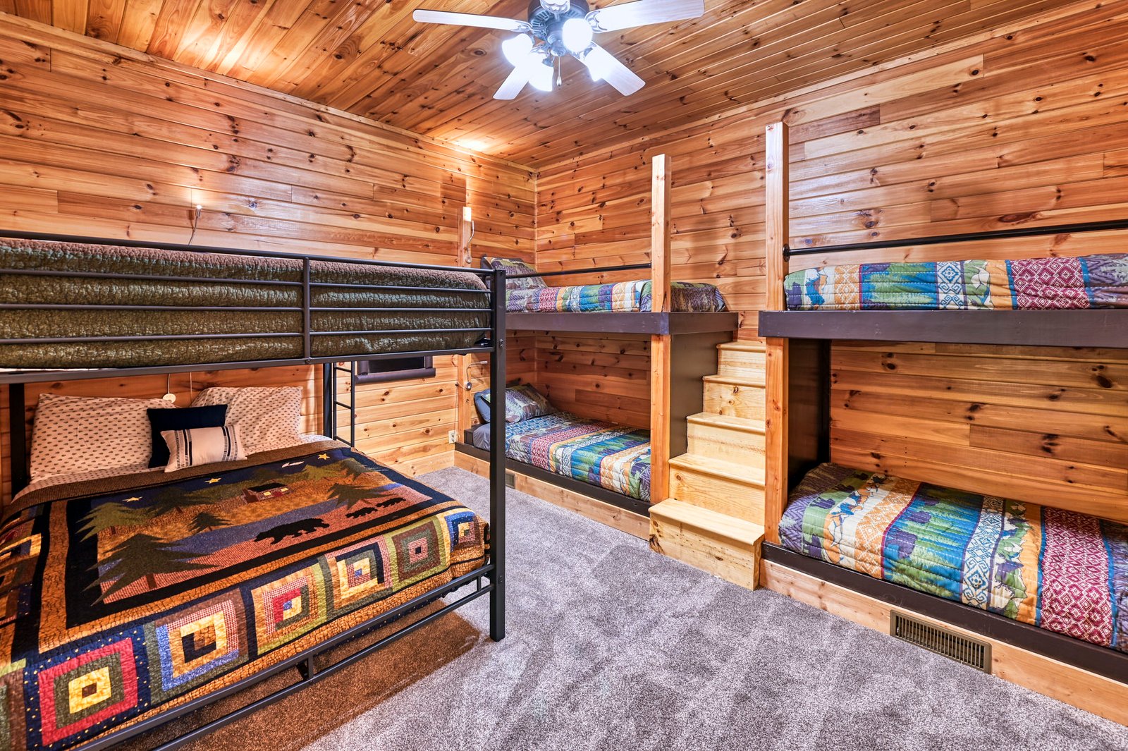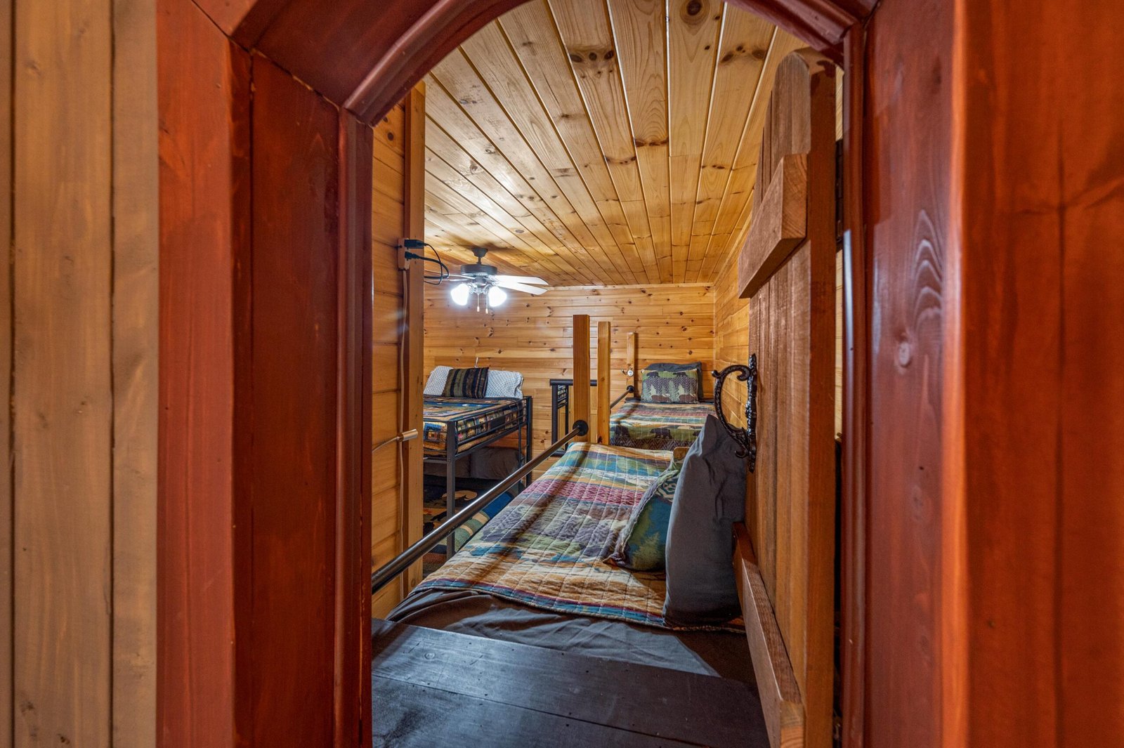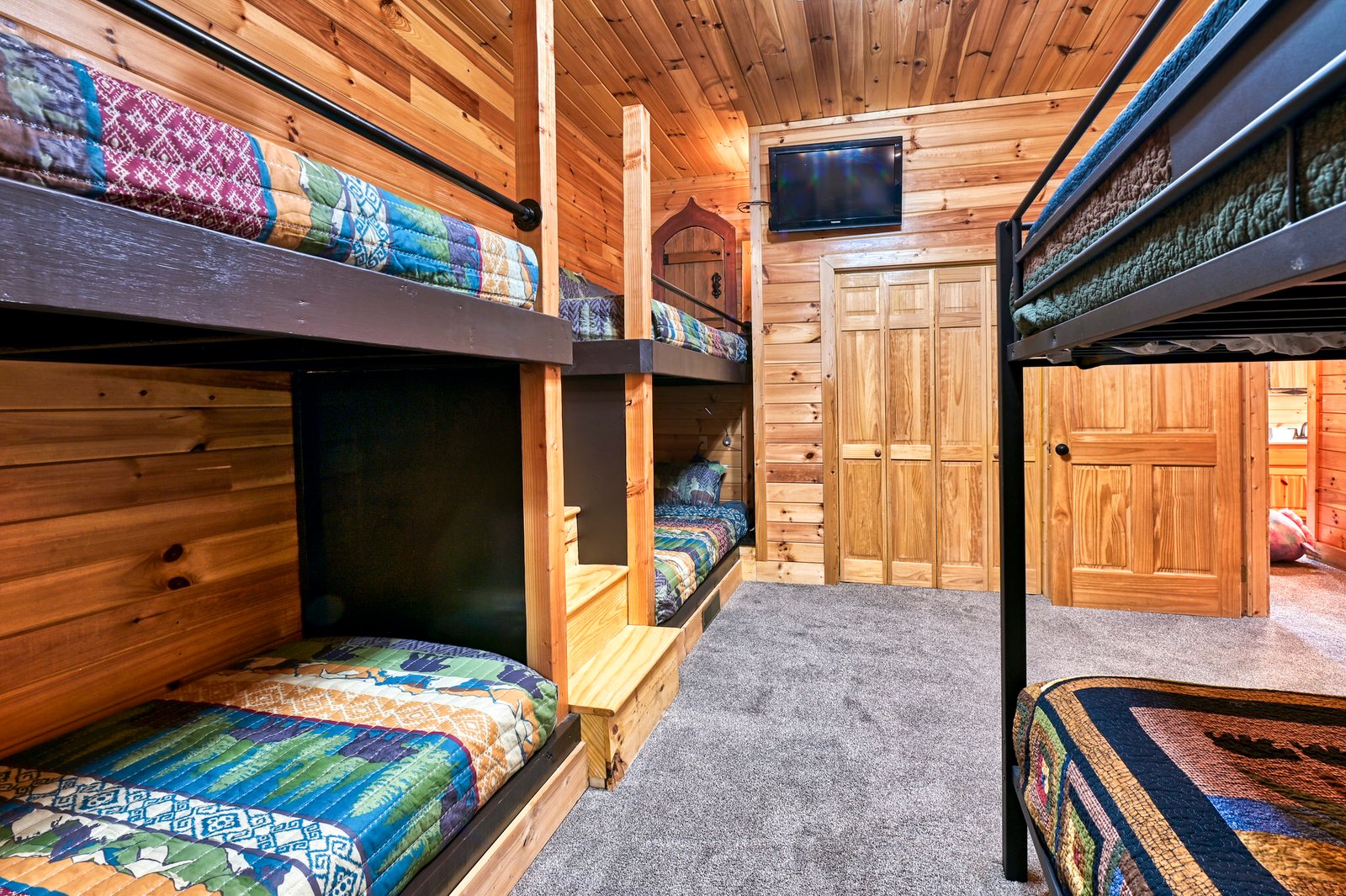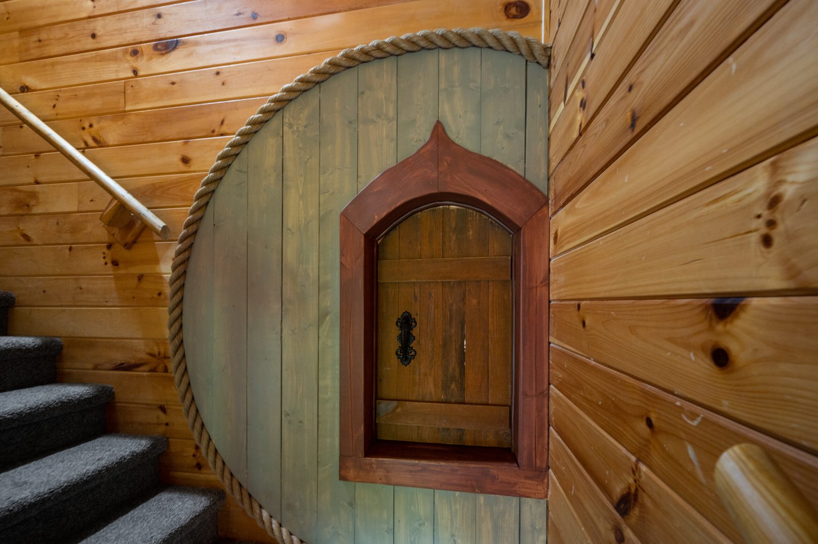 The cabin sleeps up to 16 guests across 5 bedrooms and 4 bathrooms. This includes 4 king bedrooms and a whimsical hobbit-style bunk room that kids love.